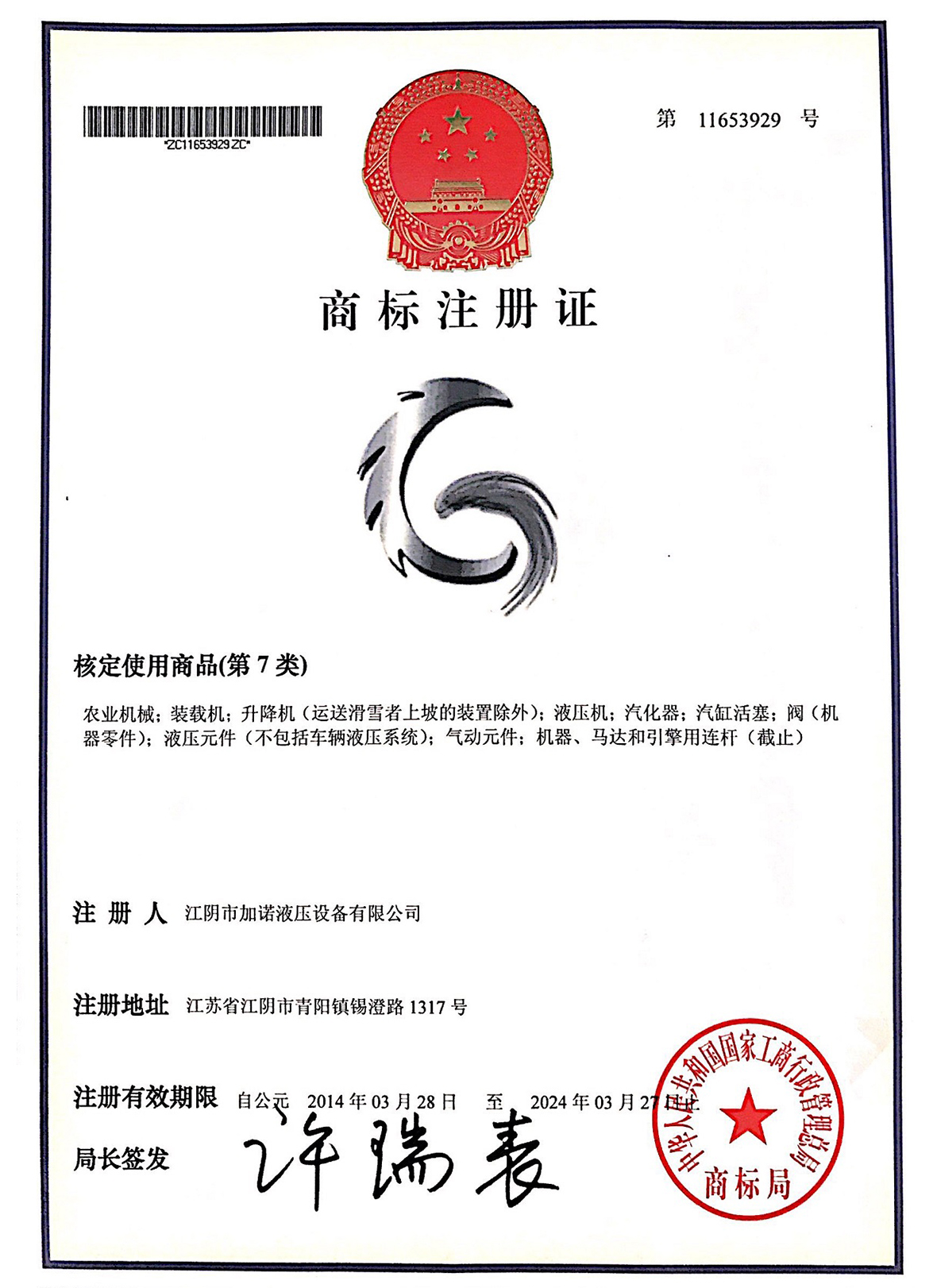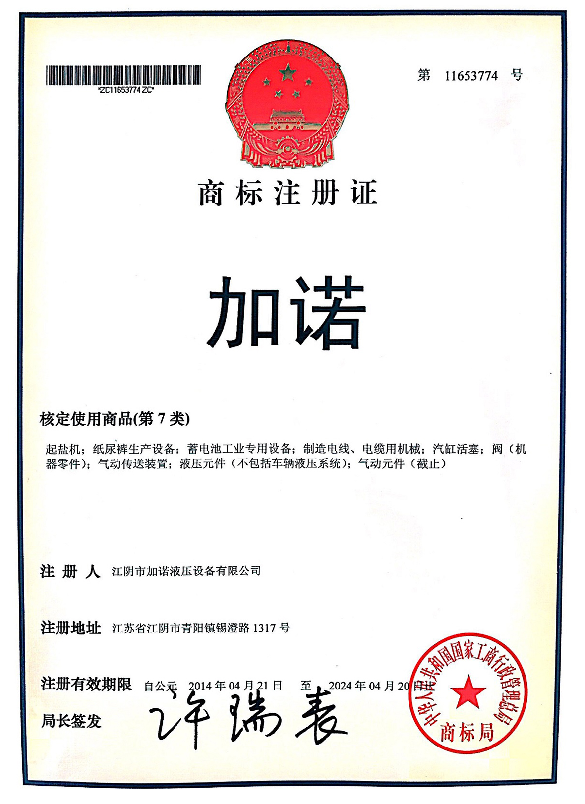 加诺商标注册证书