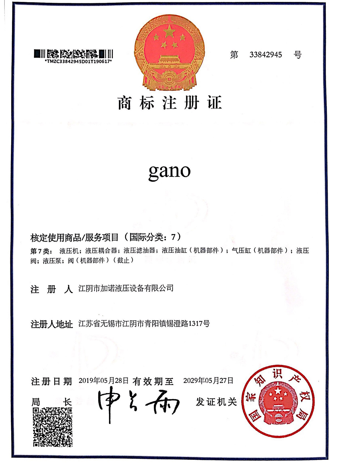 gano商标注册证书