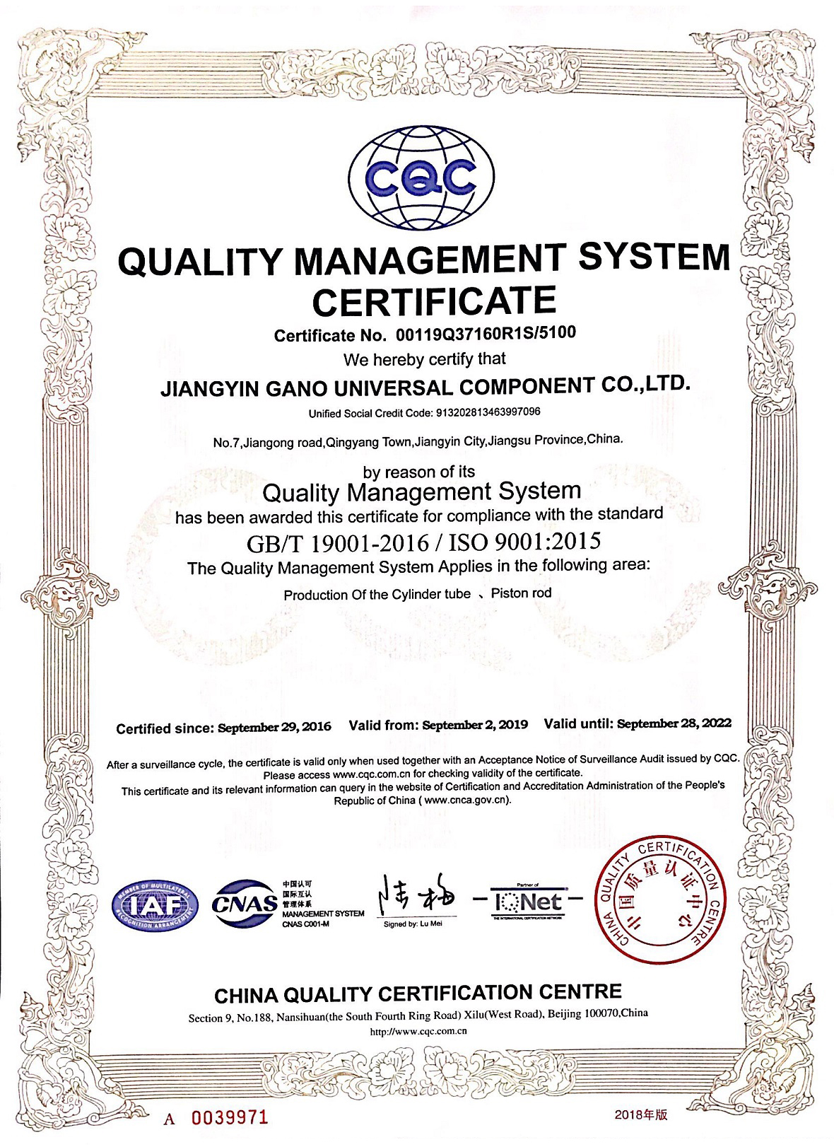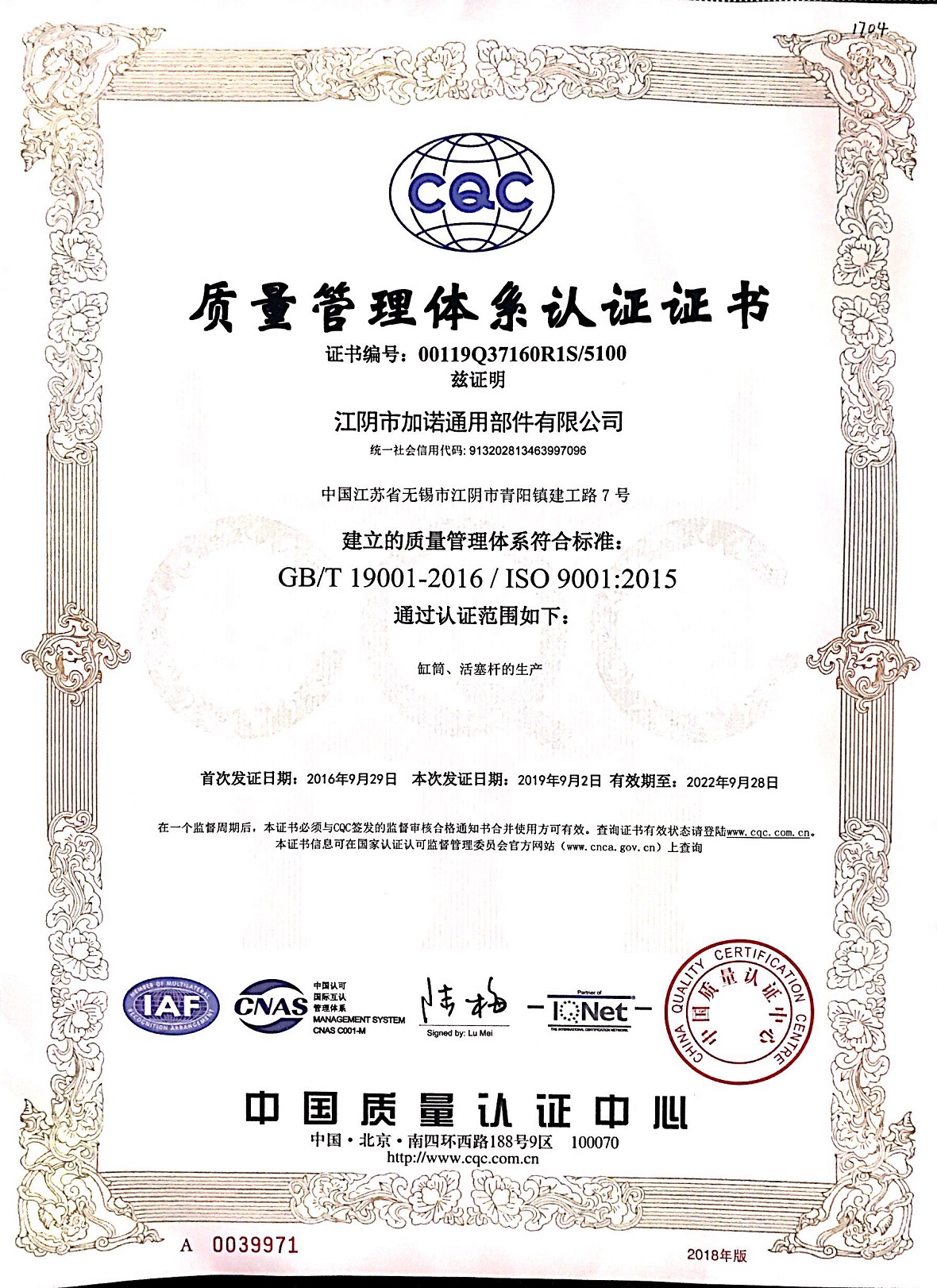 质量管理体系认证证书英文版